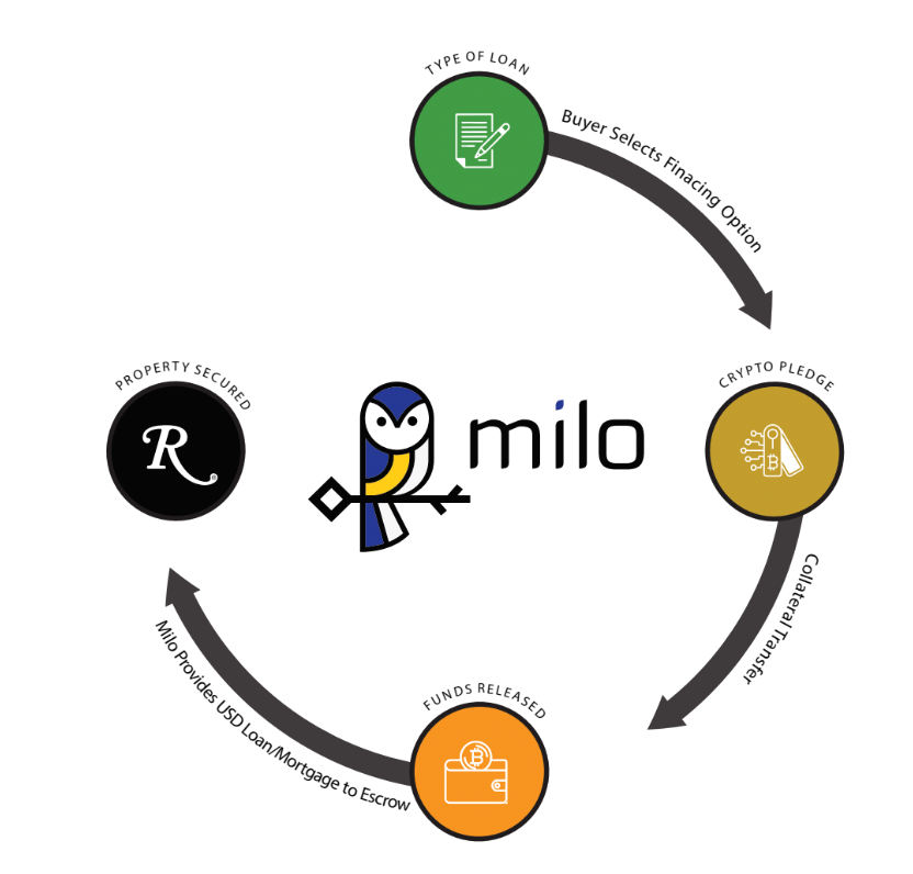 Milo is a financing path that uses crypto as collateral for a loan or mortgage. Propy is a transaction and escrow process that verifies funds and converts crypto to USD at closing through Coinbase Prime.